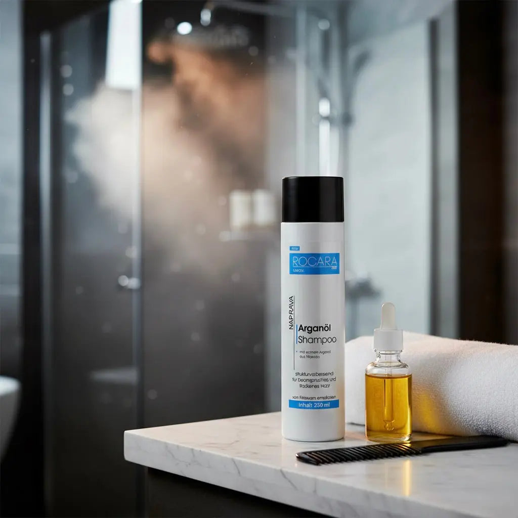 The Rocara Argan Oil Care Shampoo, 250 ml with argan oil, almond oil and vegetable glycerine pampers stressed, broken, dry and damaged hair with special care. Gives the hair brilliant color shine, irresistible suppleness and structure right down to the tips. Thanks to the building complex with vitamin B3 and provitamin B5, the hair becomes wonderfully supple and easy to comb. The hair gains elasticity and expressiveness.